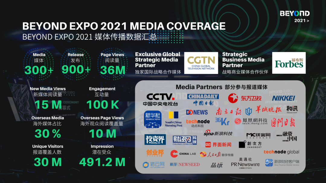 BEYOND Expo 2022将联合国内外各大干流媒体全途径、多语言传达,直击大会现场,为品牌发声,打造企业及品牌影响力,提高企业及品牌价值,促进前沿立异技能推翻现状,为可继续的未来供给连绵不断的动力。