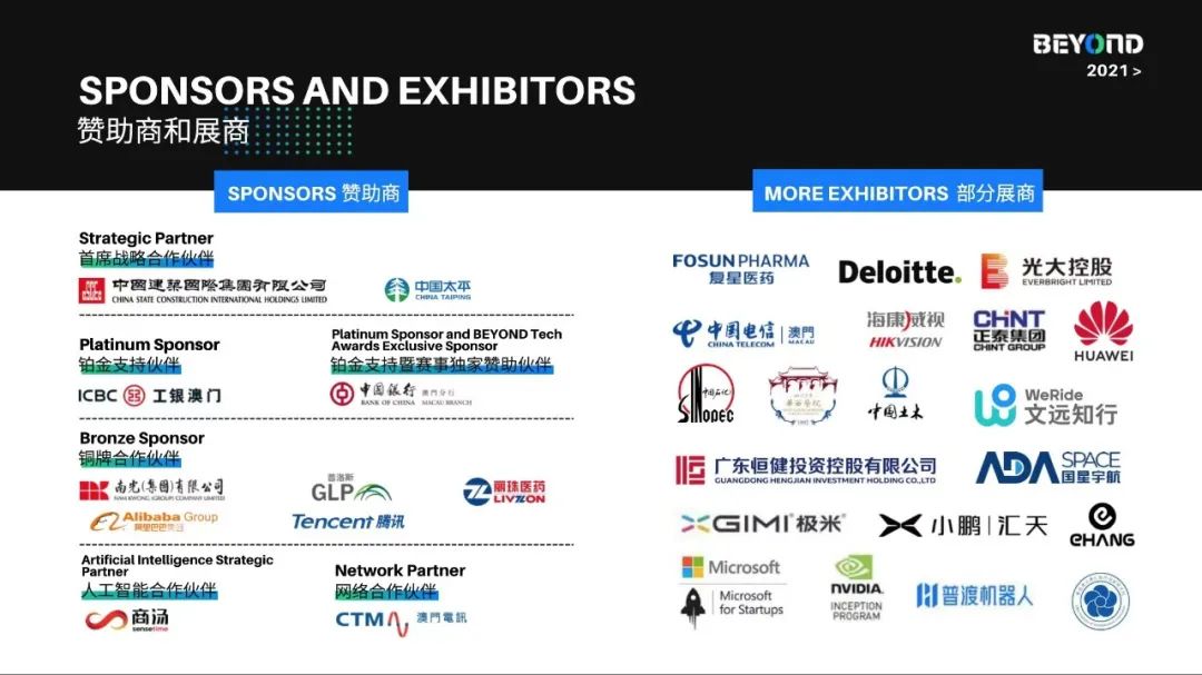 BEYOND Expo展区建立近5万平方米,BEYOND携手上百家职业尖端企业展商会集露脸。来自阿里巴巴、澳门电讯、澳门中银、德勤、复星集团、工银澳门、光大控股、海康威视、恒健控股、华大基因、华为、华西医院、极米科技、丽珠医药、南光集团、普渡科技、商汤科技、腾讯集团、小鹏汇天、亿航、正泰集团、我国电信、我国建筑世界、我国石化、我国和平、我国土木工程(澳门)有限公司、中邮器件、CGTN、贵州省展团、江苏省展团、四川省展团、浙江省展团、深圳市科学立异委员会展团、HKX展团、微软加速器展团、英伟达展团、粤港澳大湾区协同立异研究院展团、中关村科学城展团等跨国公司及展团的代表(展团均依照首字母排序)在展厅为参加观众展现其最新产品及前沿科技立异理念,一起取得了高效品牌曝光。
