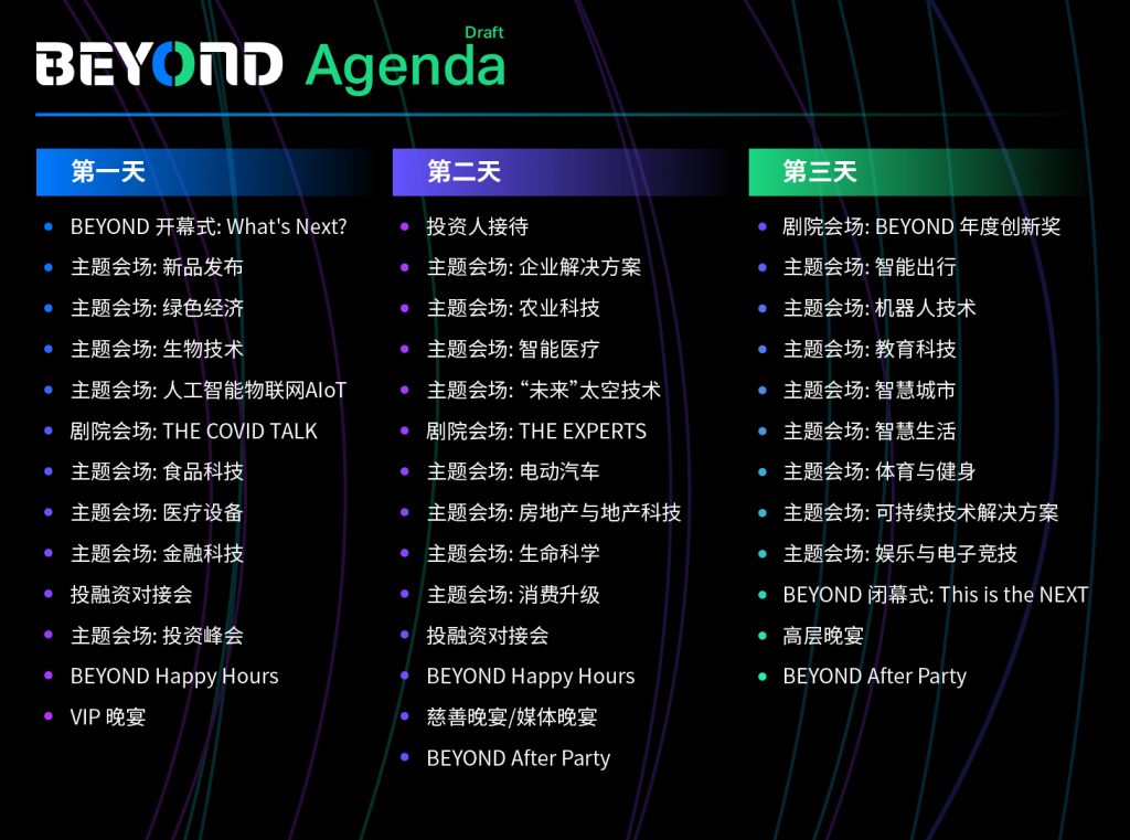 BEYOND世界科技立异饱览会将举行隆重开幕式及数十场次主题论坛,深化分析和发掘触及绿色经济、节能环保、农业与食品科技、医疗、健康、生命科学、未来出行、才智城市、5G物联网、金融科技、才智日子、消费晋级、未来科技等职业的风向和技能革新和工业立异内核,约请国内外科技立异范畴企业、全球各工业头部企业参加联动,一起构建国内国外双循环的新的格式,同期还将举行投融资、政府协作、商务协作等对接会,促进职业界高效对接及交流,以及立异造访和更多轻松的集会派对,为与会者营建更多交流交流的场景。