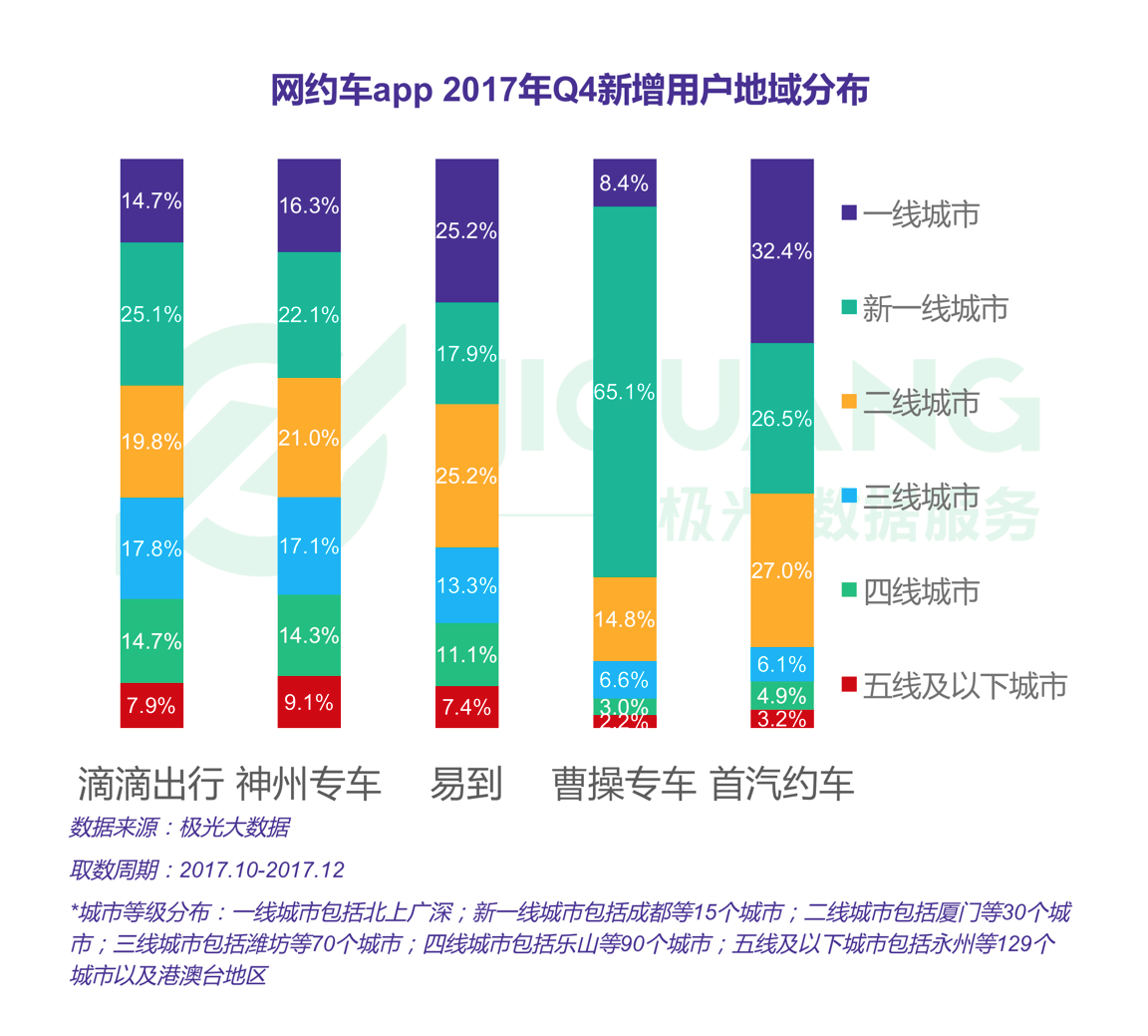 依据极光大数据统计,主流网约车app 2017年Q4的首要新用户增加点在新一线城市和二线城市,以用户体量最大的滴滴出行为例,跟着在一线城市的深度浸透,滴滴在一线城市的人口增加盈利已逐步消失,新一线城市成为滴滴最大的新用户增加点,为Q4贡献了超越1/4的新用户。