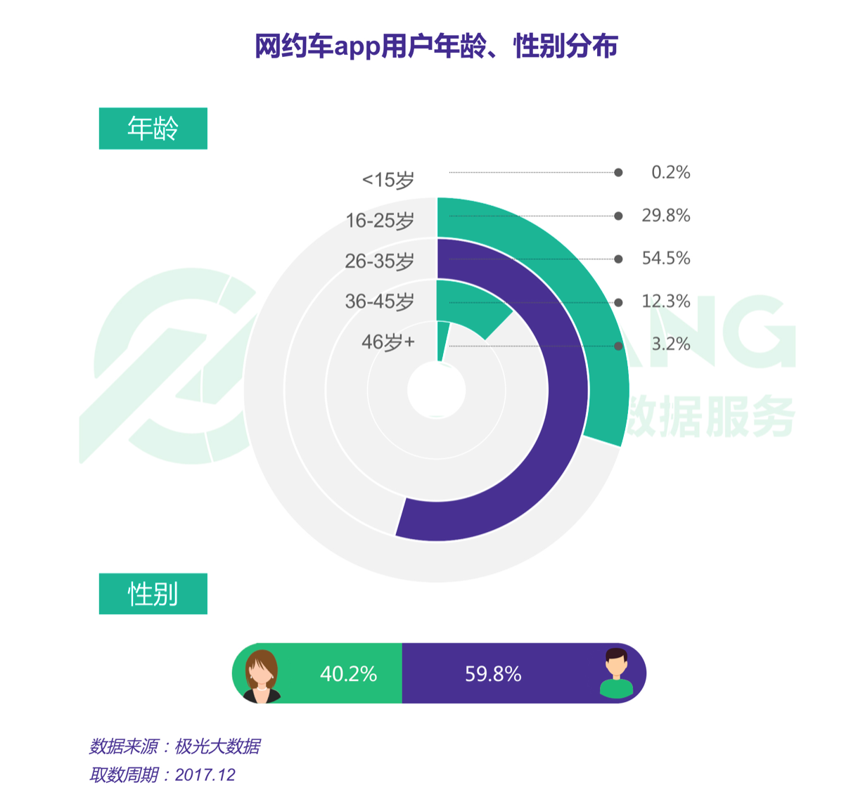 经过调查极光大数据发现,网约车app的首要用户群为35岁以内的男性用户,其间男性用户占比为59.8%,35岁及以内用户占比超越多半。